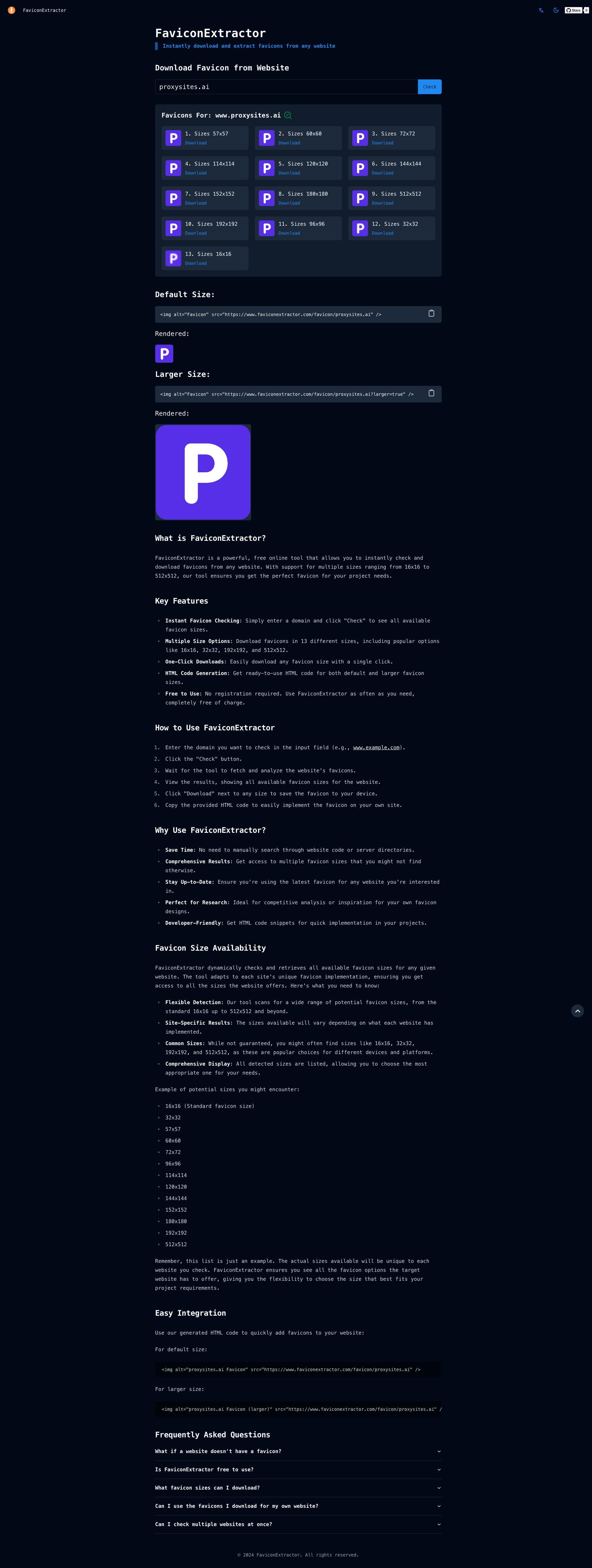 Favicon Downloader 是一个用于提取和下载网站图标的工具,支持从多种来源获取图标,包括 Google 和 DuckDuckGo。用户可以通过 API 接口或直接访问网站来获取所需的图标。该工具提供了高效的加载速度,特别适合在生产环境中使用。